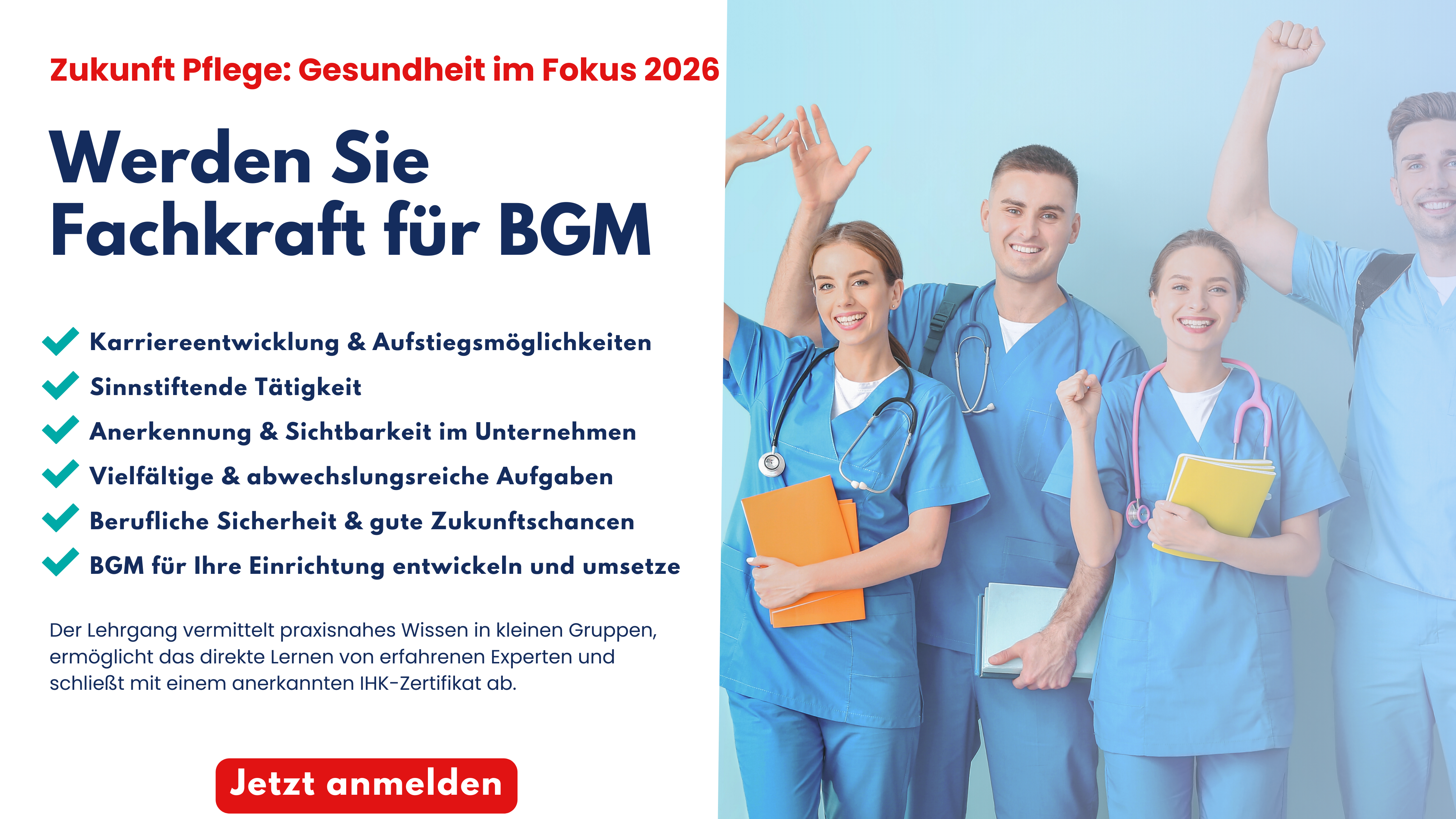 Ideal für alle, die BGM nicht nur umsetzen, sondern strategisch vorantreiben und an den besonderen Belastungen von Klinik und Pflege ausrichten möchten.
